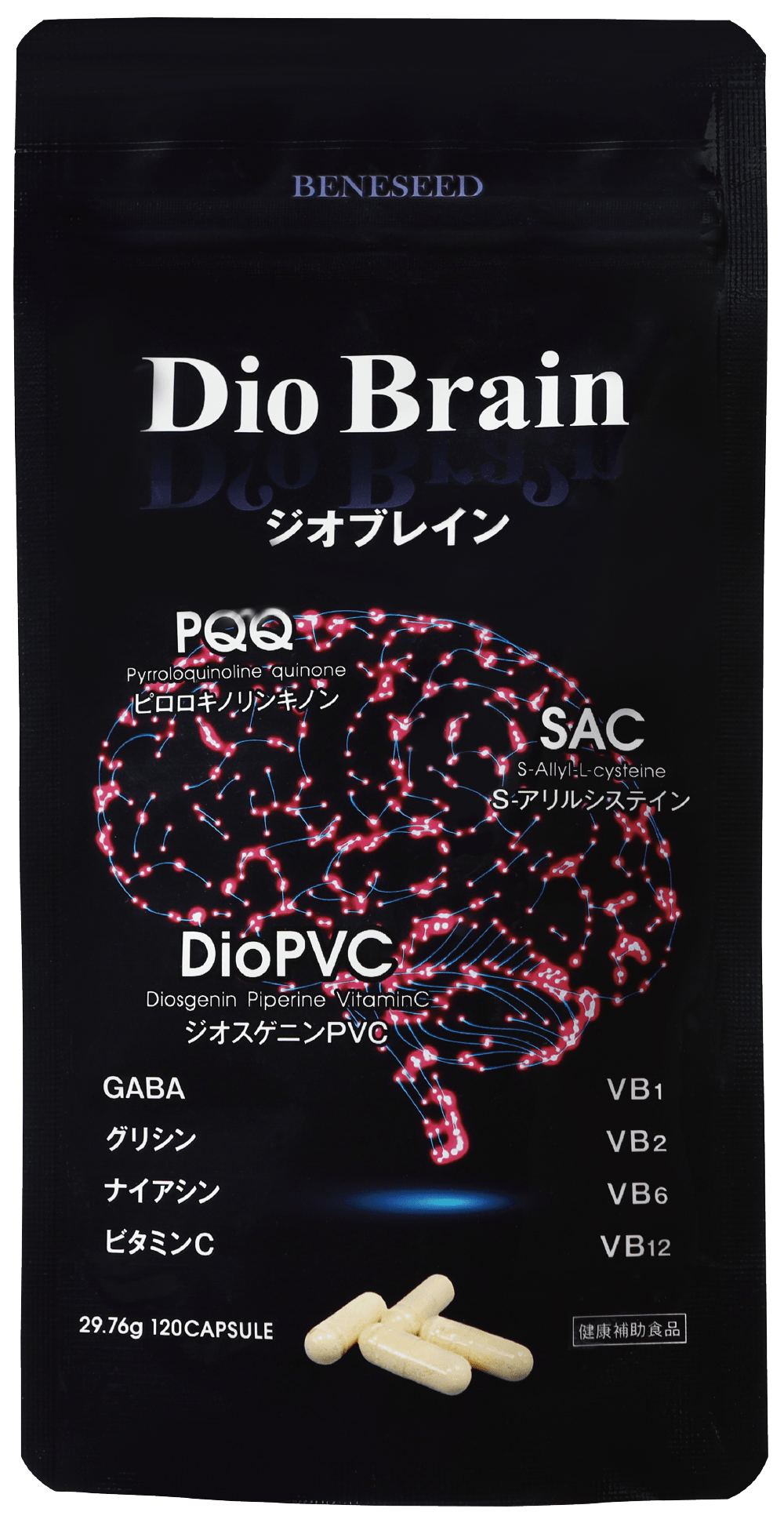 超高齢化社会を迎えている日本では、認知症を患う高齢者が2025年には約700万人、65歳以上の5人に1人とも言われています。「ジオブレイン」は、オリジナル原料「ジオスゲニン」に加えて、「PQQ」「SAC(S-アリルシステイン)」「GABA」「グリシン」「ナイアシン」「ビタミンB群」などを配合。男性・女性それぞれ特有の悩みなど年齢からくる様々な不安要素を解消し、未来の健康を支え、健康寿命を延ばすためのサポートをするサプリメントです。